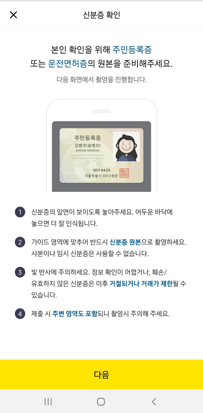 계좌비밀번호와 신분증 촬영으로 본인인증을 확인하면